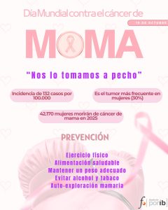 El próximo 19 de octubre es el Día Mundial del Cáncer de Mama, fecha para recordar la necesidad de concienciar a la población sobre una enfermedad que supone el 30% de los tumores en mujeres y cuya incidencia, a nivel mundial, es de 1 de cada 20 mujeres que padecerán cáncer de mama a lo largo de su vida.